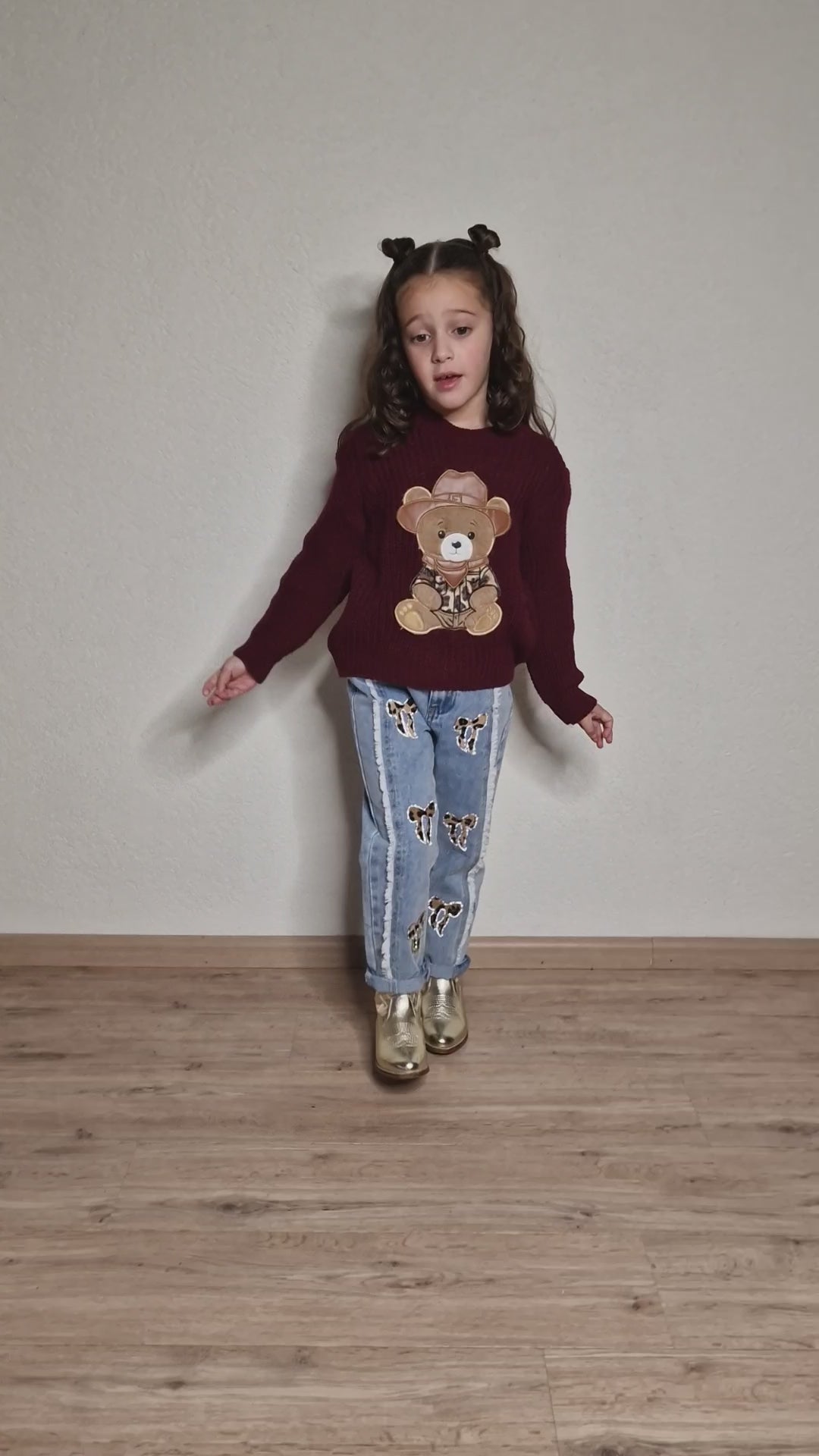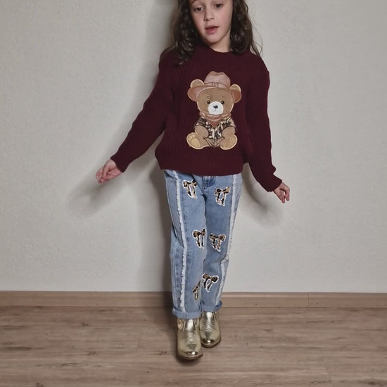 De Teddy Charm Knit is pure cozy cuteness. De warme wijnrode tint, het zachte breisel en de schattige teddy-applicatie maken dit truitje een echte favoriet voor de koudere dagen. Het is de perfecte mix van comfort en charme — ideaal voor school, een dagje weg of een knusse middag thuis.